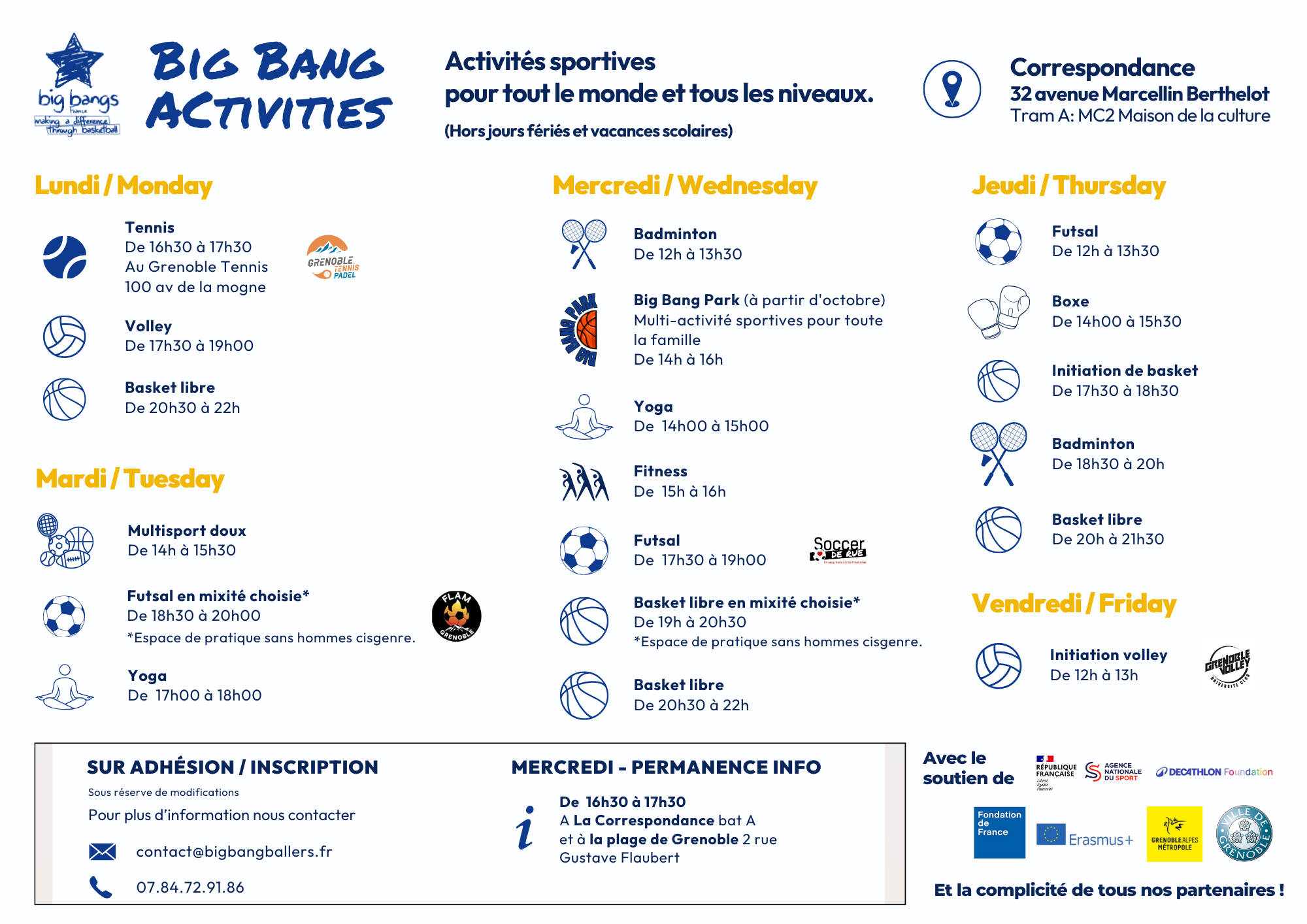 Rendez vous à la correspondance pour trouver le gymnase des big bangs et participer à toutes les activités (sauf tennis, voir programme)